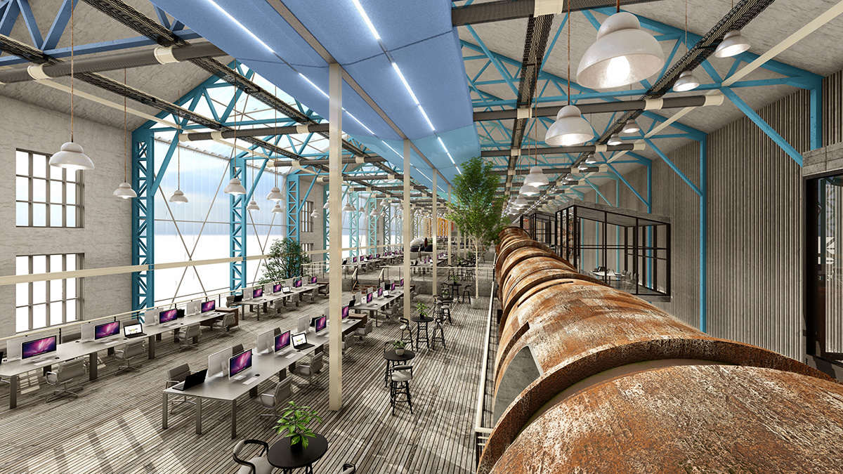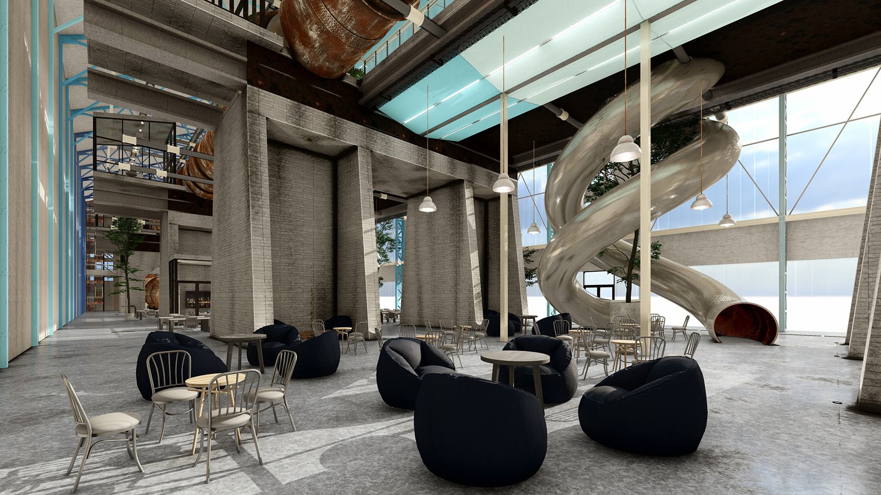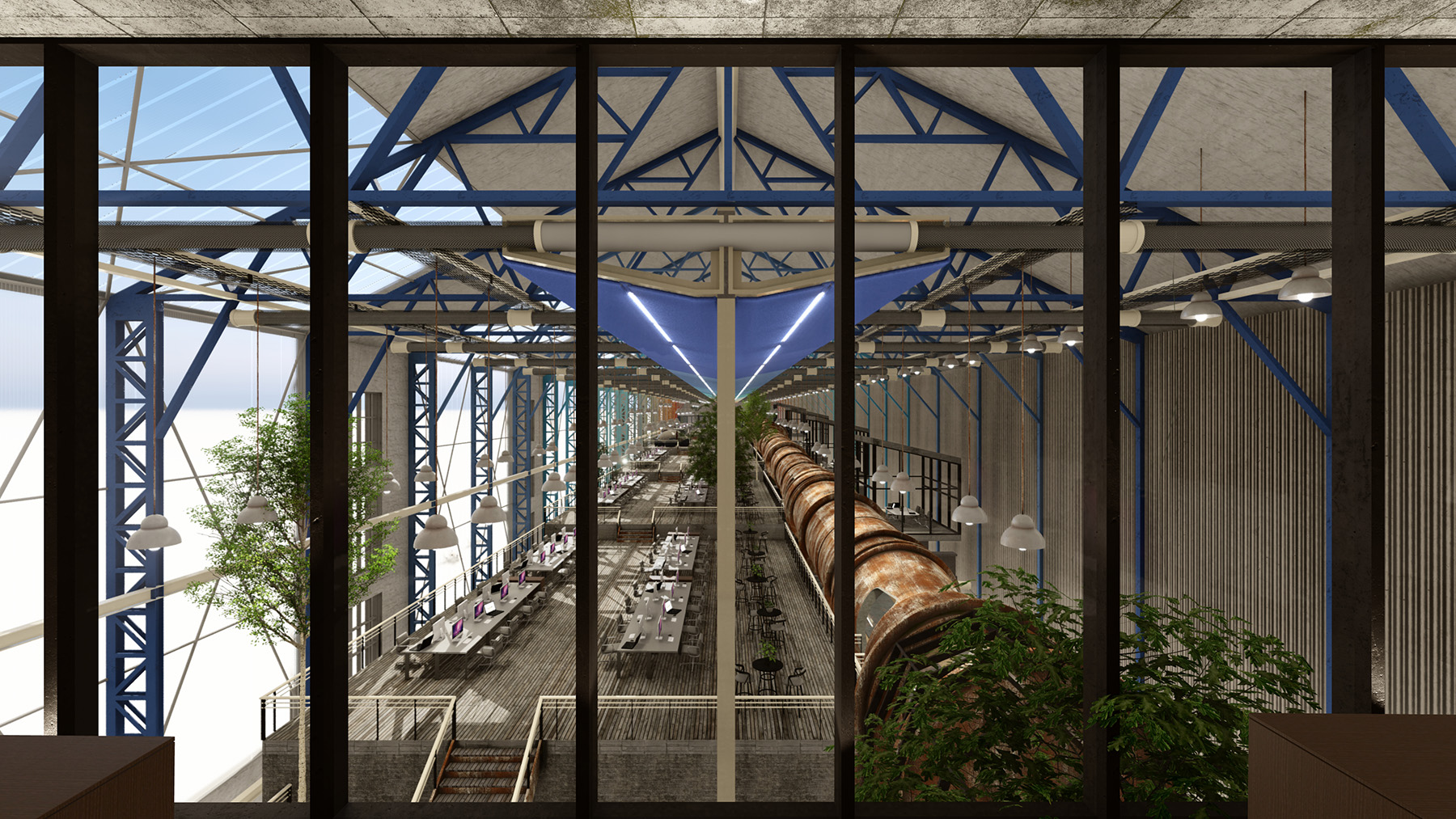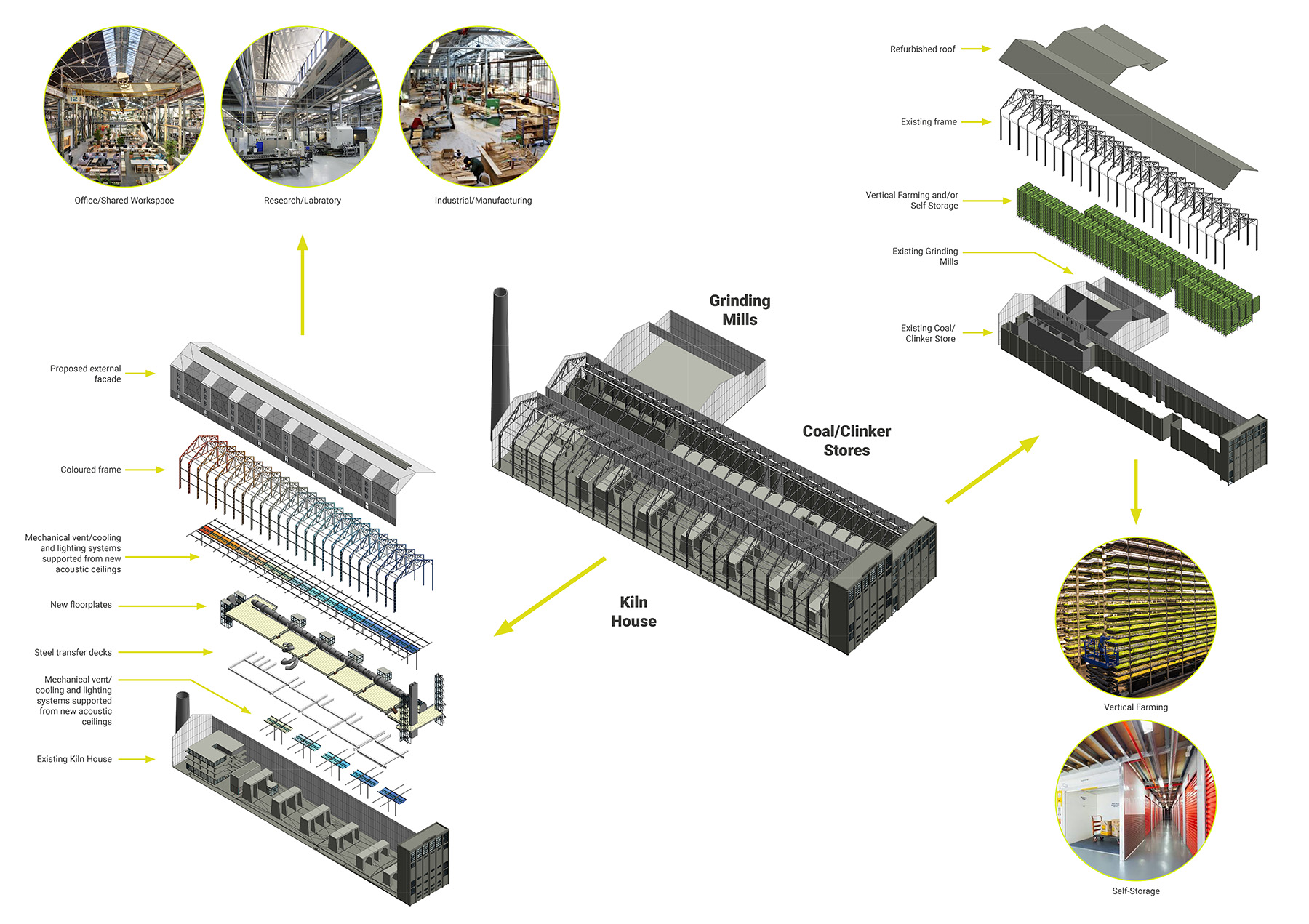 The extraordinary existing building comprises 3 elements, the Kiln House, the Coal/Clinker Store and the Grinding Mills. The Kiln House is largely clad in single sheet asbestos cladding and roofed in sheeting which is beyond life and which needs to be removed, providing an opportunity to repurpose with an active use reliant on daylight. For this, we are proposing office/shared workspace, but this approach to providing additional space could also be used for industrial, manufacturing, life sciences, tech start-ups etc. The proposed structural approach for this area of the building consists of using the existing internal structure to support all new floors, structure and MEP infrastructure. The existing steel portal frames bear no additional load and are used only to support new lightweight cladding and roofing systems. The immense and striking rotary kiln has been utilised as circulation space, connecting the new spaces with this long metal tube.